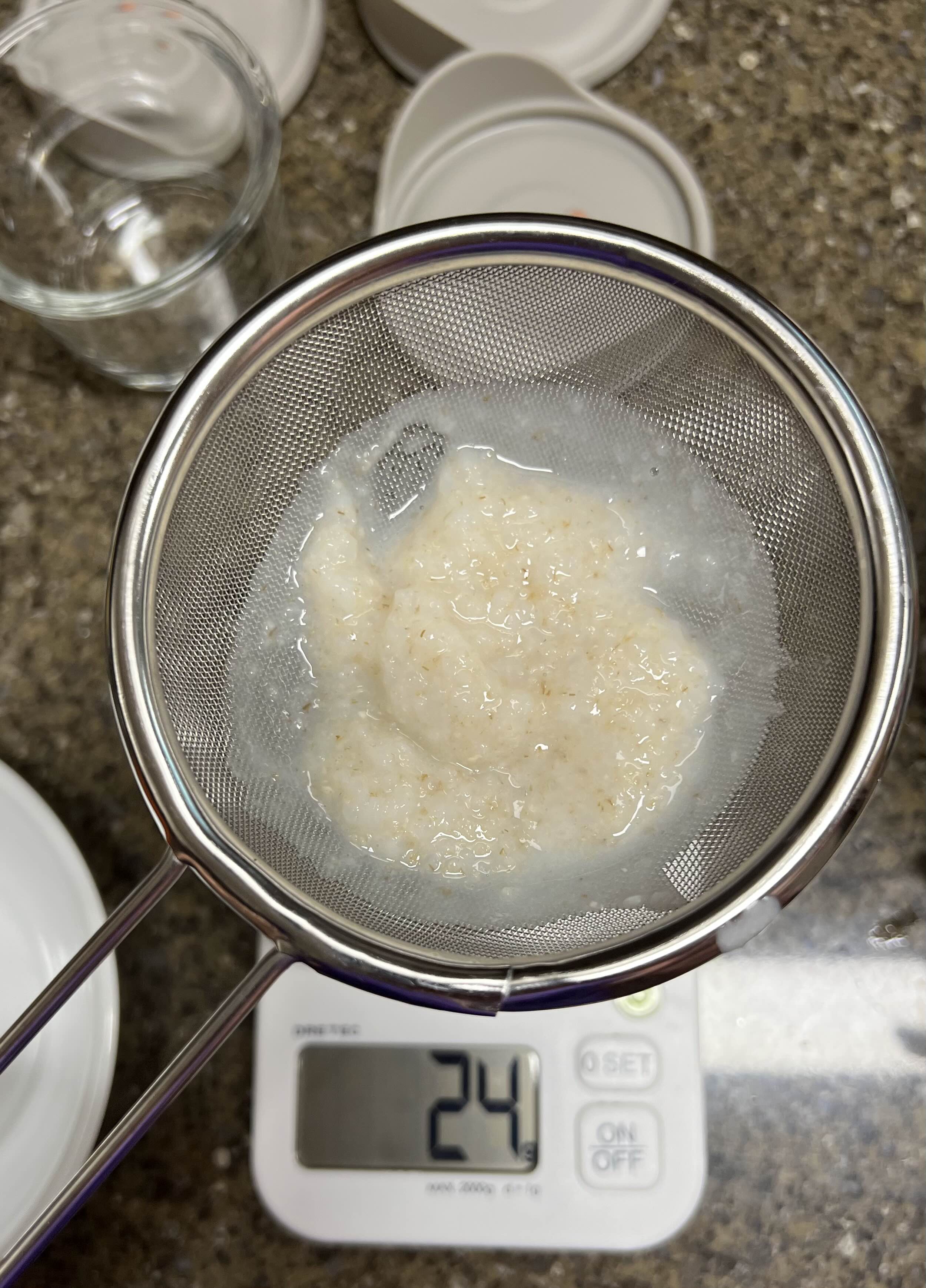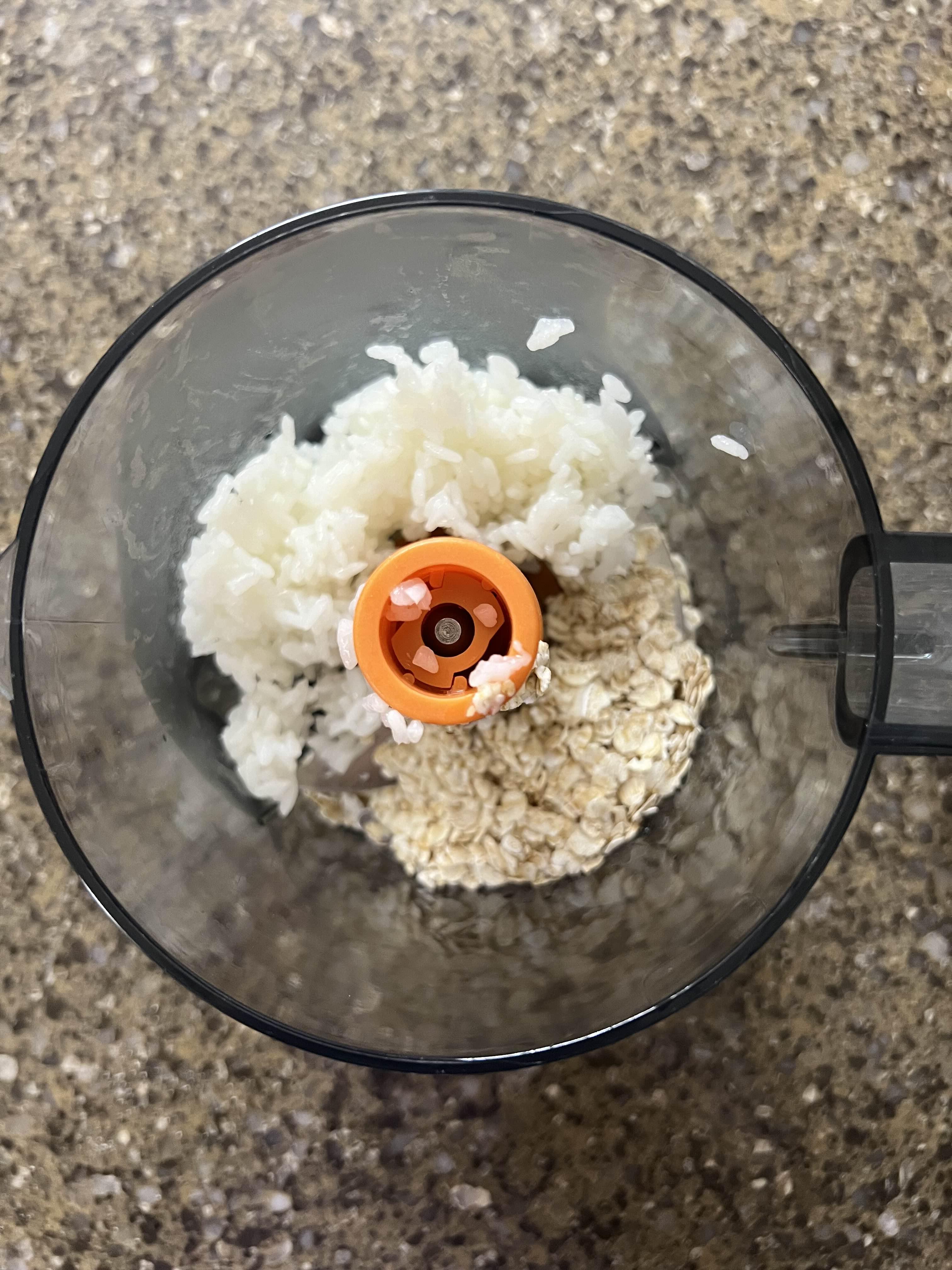 2. 물통에 생수(삼다수)를 80% 정도 넣고, 계량한 흰쌀밥과 오트밀을 이유식 용기 통에 넣는다.