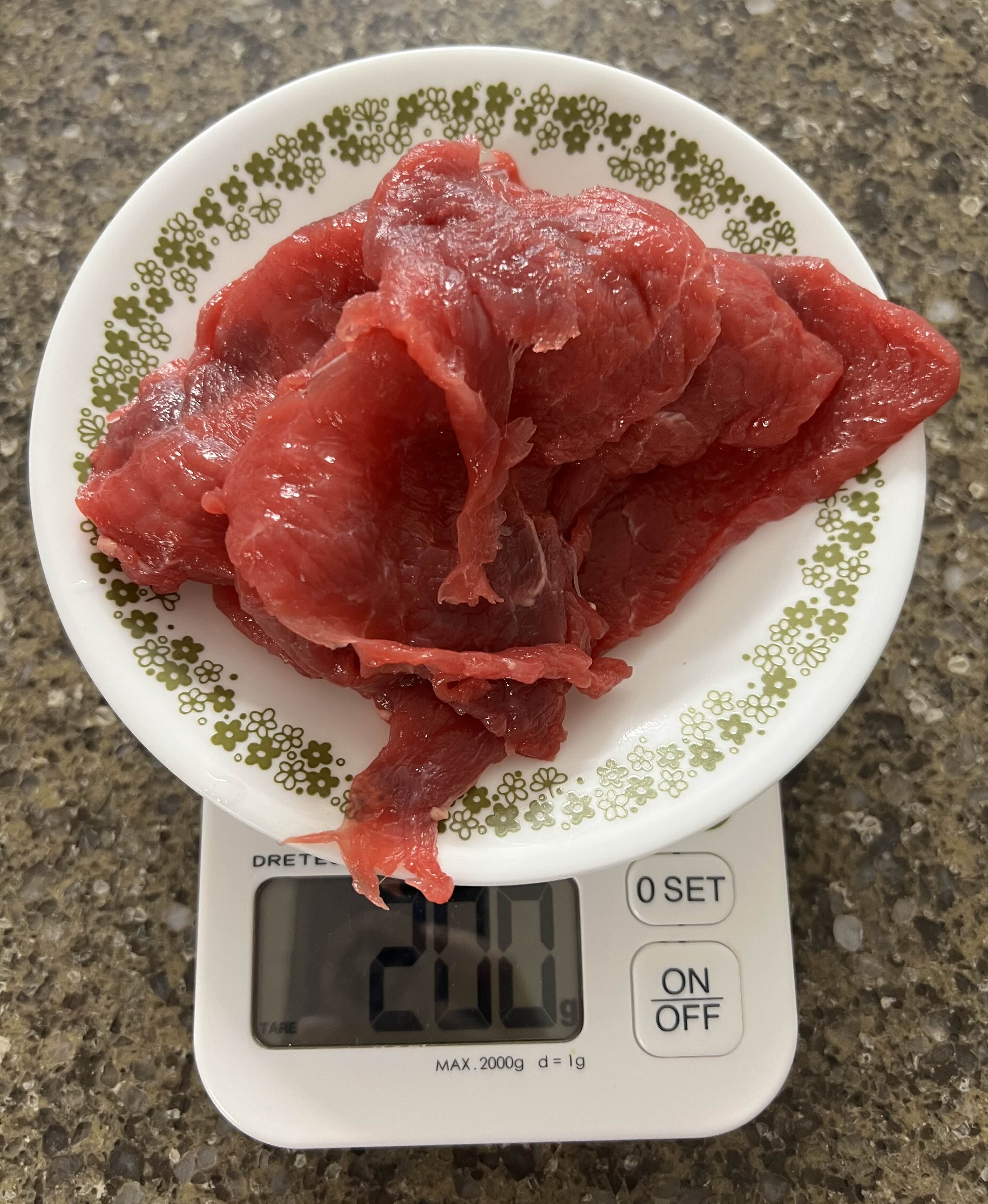 1. 소고기 안심부위 200g을 물에 한 번 씻은 후 칼로 자르기