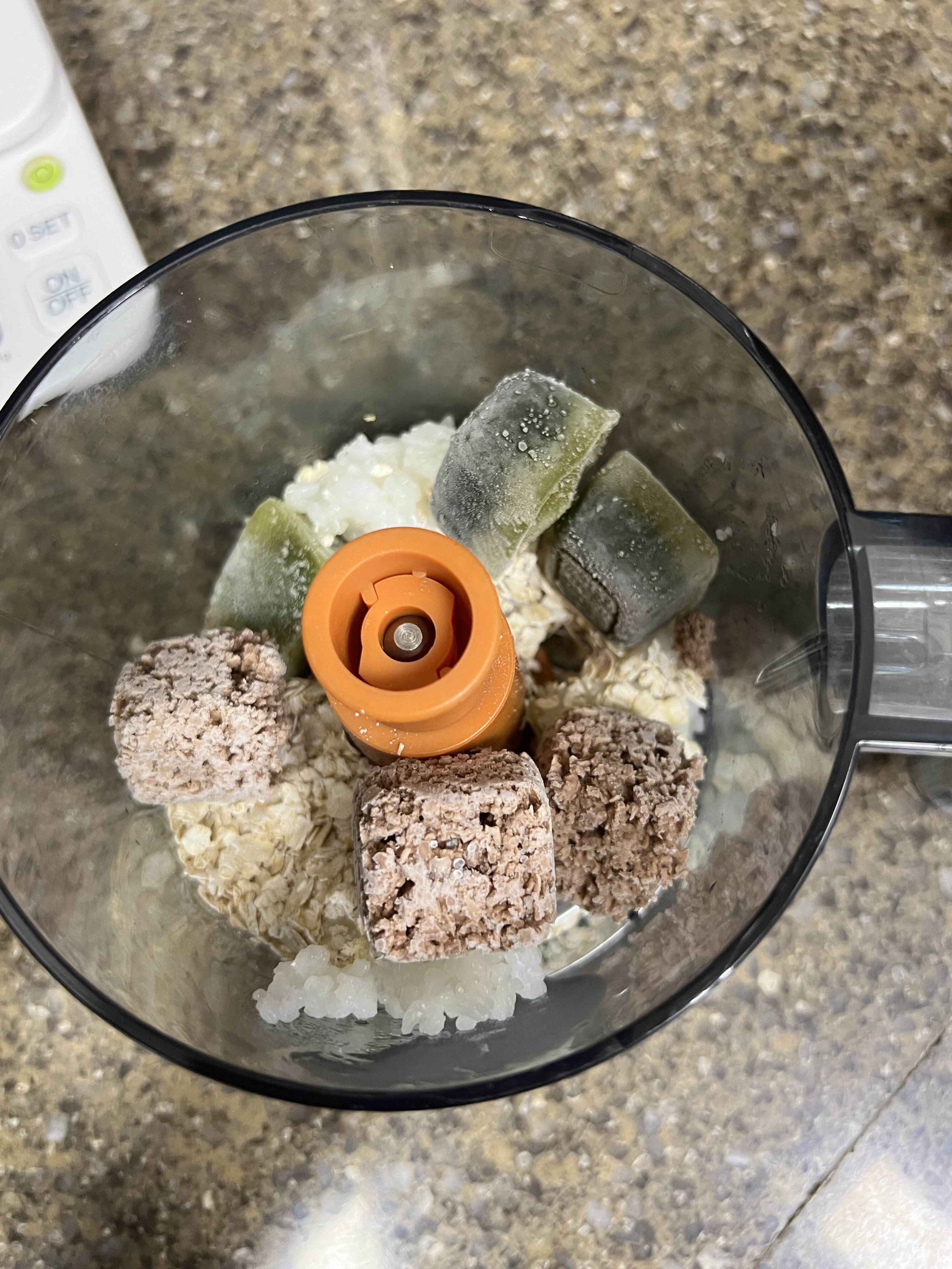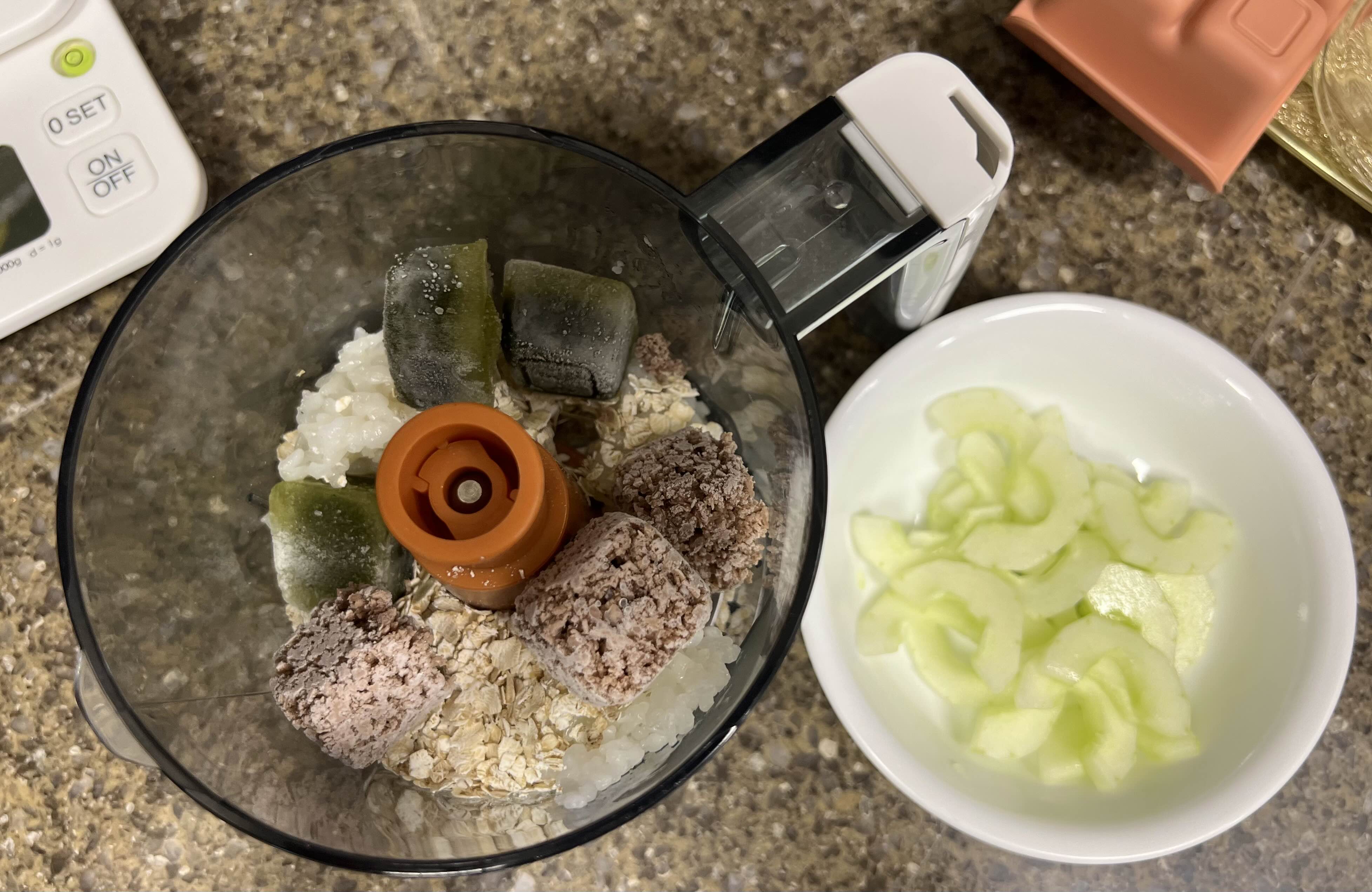 1. 흰쌀밥 60g, 오트밀 20g, 소고기 큐브 (10g) 3개, 청경채 큐브 (10g) 3개, 오이 47g 계량