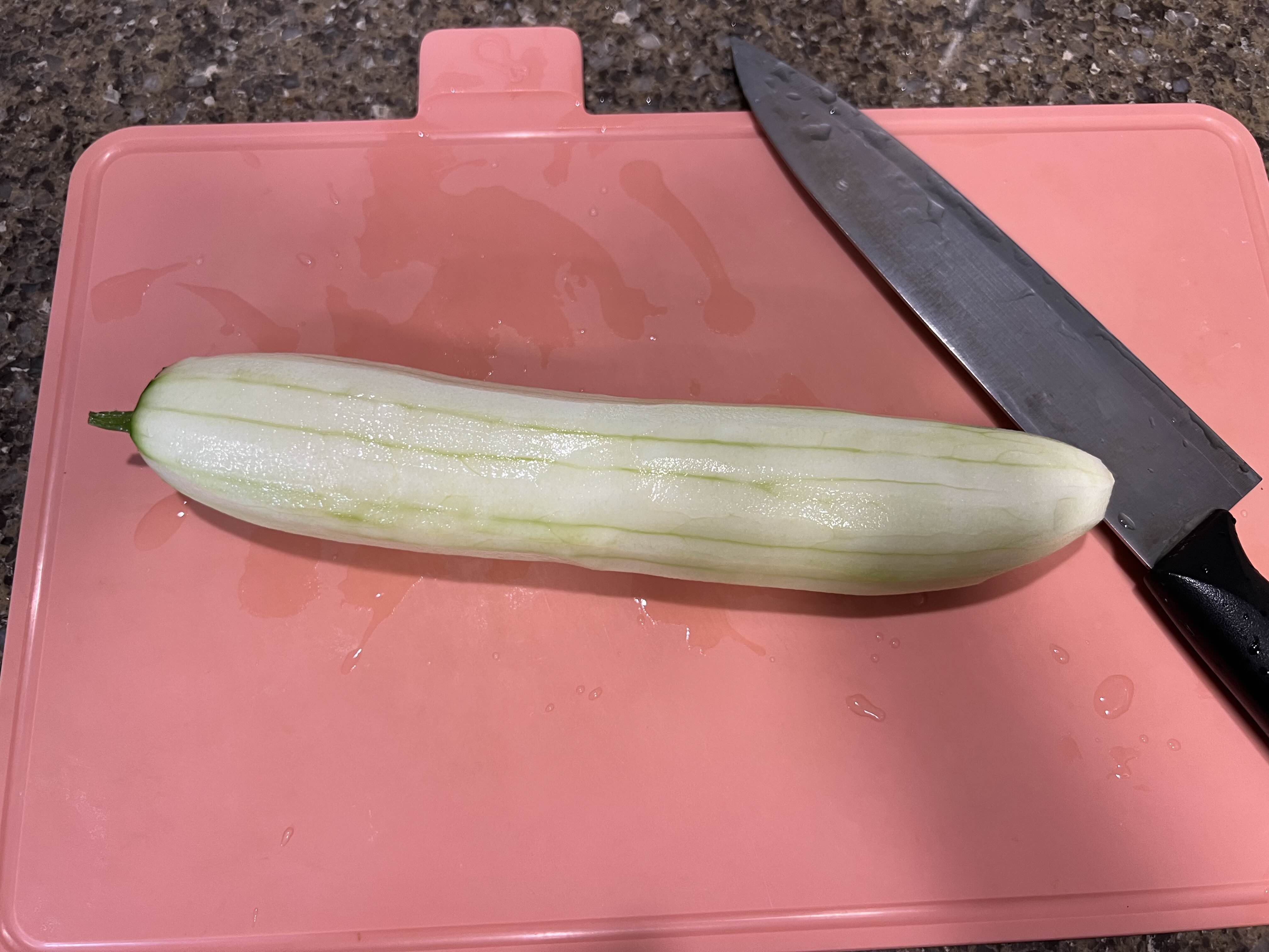 오이를 깨끗하게 씻은 다음, 껍질을 벗겼다.
