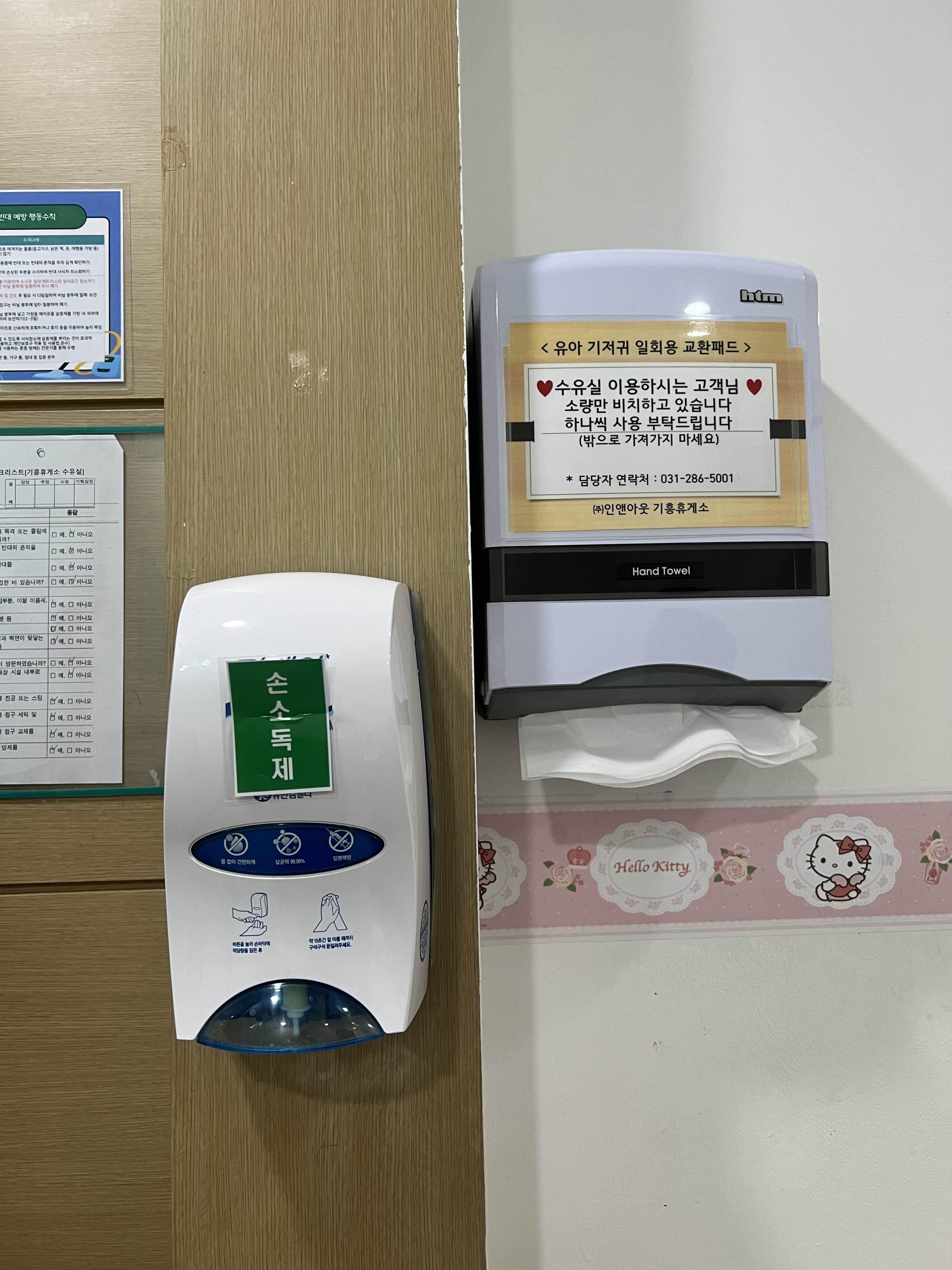 결도: 수유실은 깨끗한 편이였다.  바닥과 벽, 모든 시설이 깔끔하게 관리되어 있었고, 손 세정제와 소독제가 비치되어 있어 위생적인 환경을 느낄 수 있었다.
