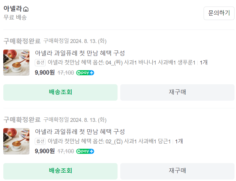 아넬라 과일퓨레 첫 만남 혜택 구성으로 2세트를 구매했다.