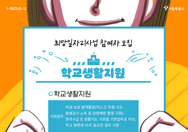 둘째, ‘학교생활지원’ 일자리는 등교 수업 이후 코로나19 상황에서 학생의 안전한 교육활동을 지원(방역활동, 원격수업 지원 등)하고 변화하는 교육환경 속에서 학교 운영의 조기 안정화를 위한 것으로, 학교 현장에 청년들을 배치한다.