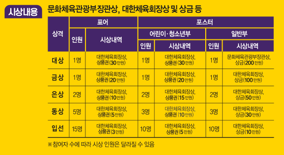 총 상금 600만원 및 300만원 상당의 문화상품권, 대한체육회장상 등이 준비되어 있다.