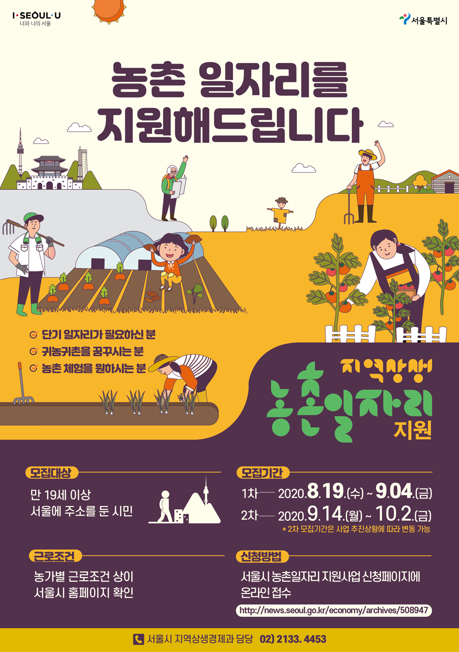 서울시에서 서울시민에게 농작업 경험과 유급 일자리를 제공하는「농촌일자리 지원사업」 참여자를 모집합니다. 가을을 맞아 농촌 경험과 함께 단기 근로 일자리를 찾는 분들의 많은 참여를 ��