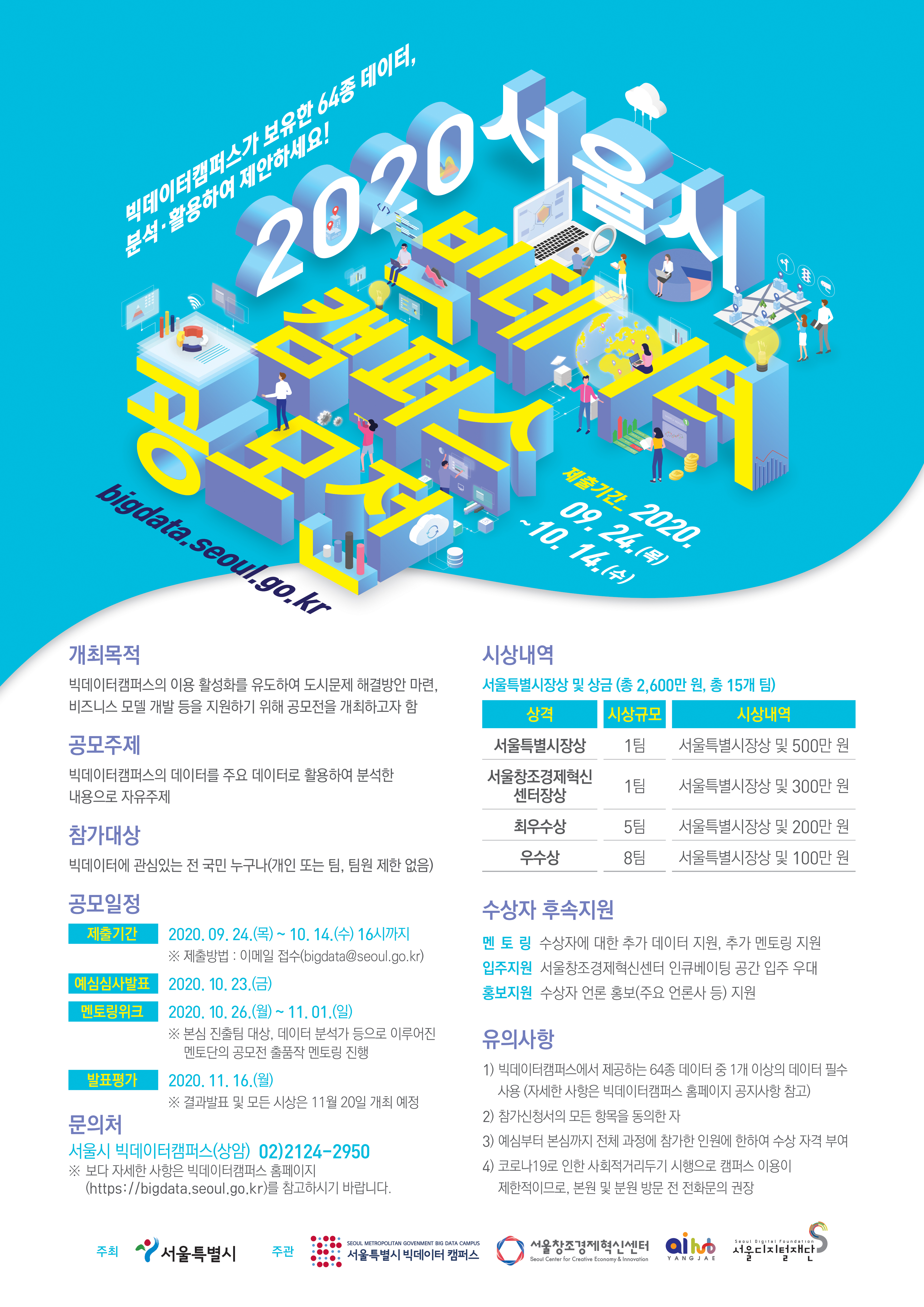 - 코로나 19로 인한 사회적 거리두기 시행으로 캠퍼스 이용이 제한적입니다. 분원 및 본원 방문 전 전화 문의 권장※ 공모전의 변경 사항은 ‘내 손안에 서울(http://mediahub.seoul.go.kr)’ 및 ‘빅데이터캠퍼스 홈페이지(http://bigdata.seoul.go.kr)’를 통해 공지