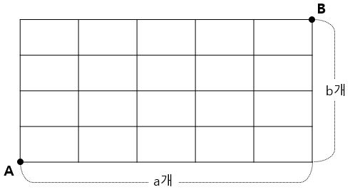 : 그림과 같이 가로 방향의 칸의 수가 a, 세로 방향의 칸의 수가 b일 때, 이 도로망을 따라 A지점에서 B지점까지 최단 거리로 가는 경우의 수는