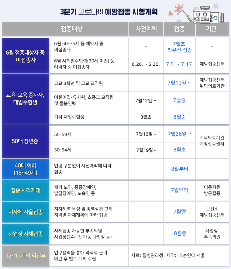 55∼59세는 7월 12일주에 예약을 하고 7월 26일주에 접종하며,50∼54세는 7월 19일주에 예약하고 8월 초에 접종한다.