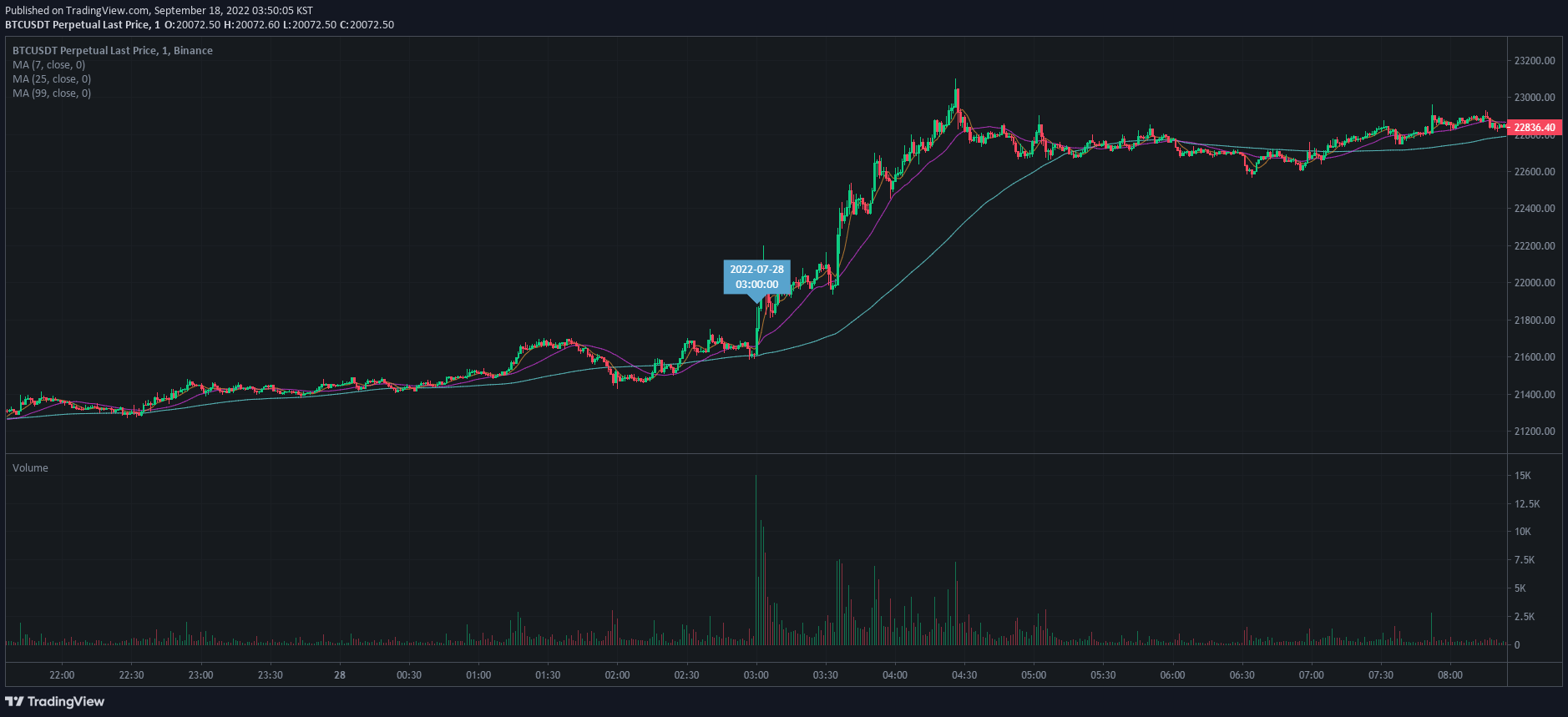 1분봉부터 보면..내리다가 올랐다..그런데 다시 보니 대략 3:20분 정도부터 7시반까지 2천달러 이상이 올랐다.