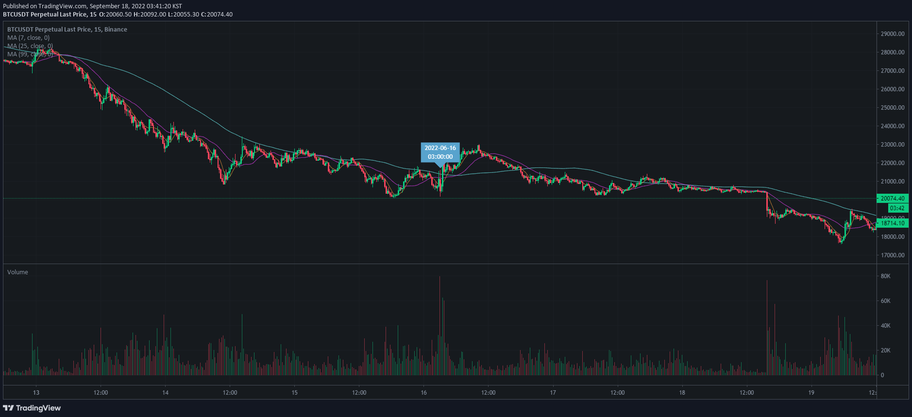 다음은 15분봉이다. 굳이 볼필요가 있는것인가..22k까지 올랐다가 19일에는 18k를 깨고 올라왔다.