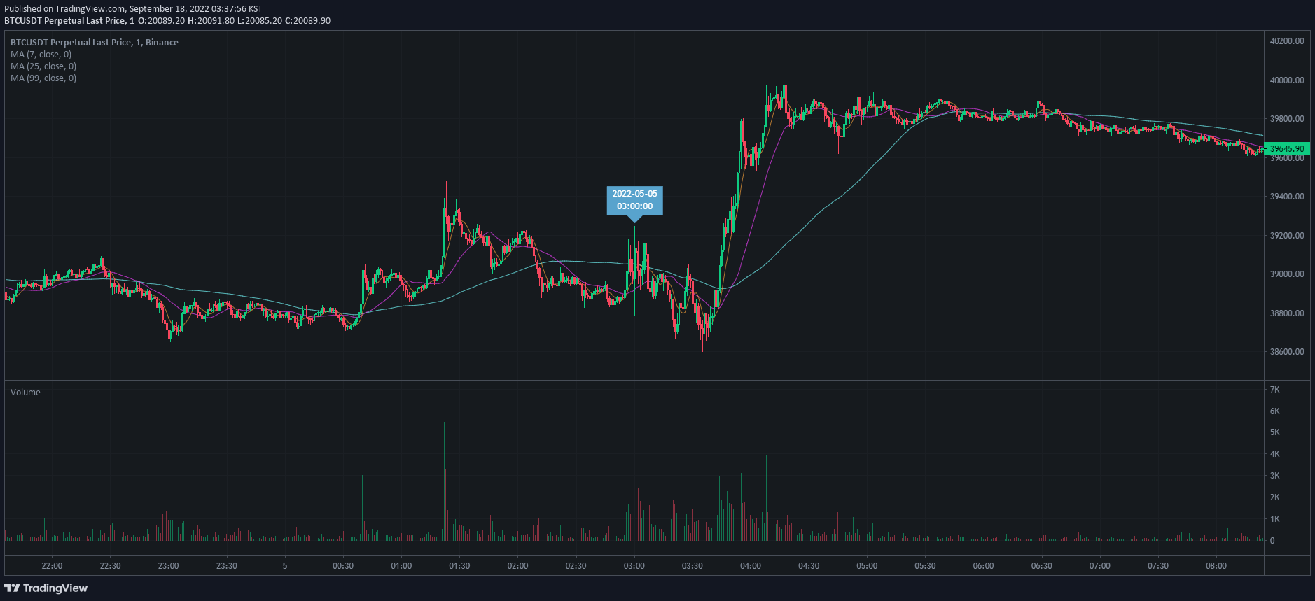 다음은 5월 5일 03시 부근의 바이낸스 BTCUSDT 선물차트 1분봉 차트이다.
