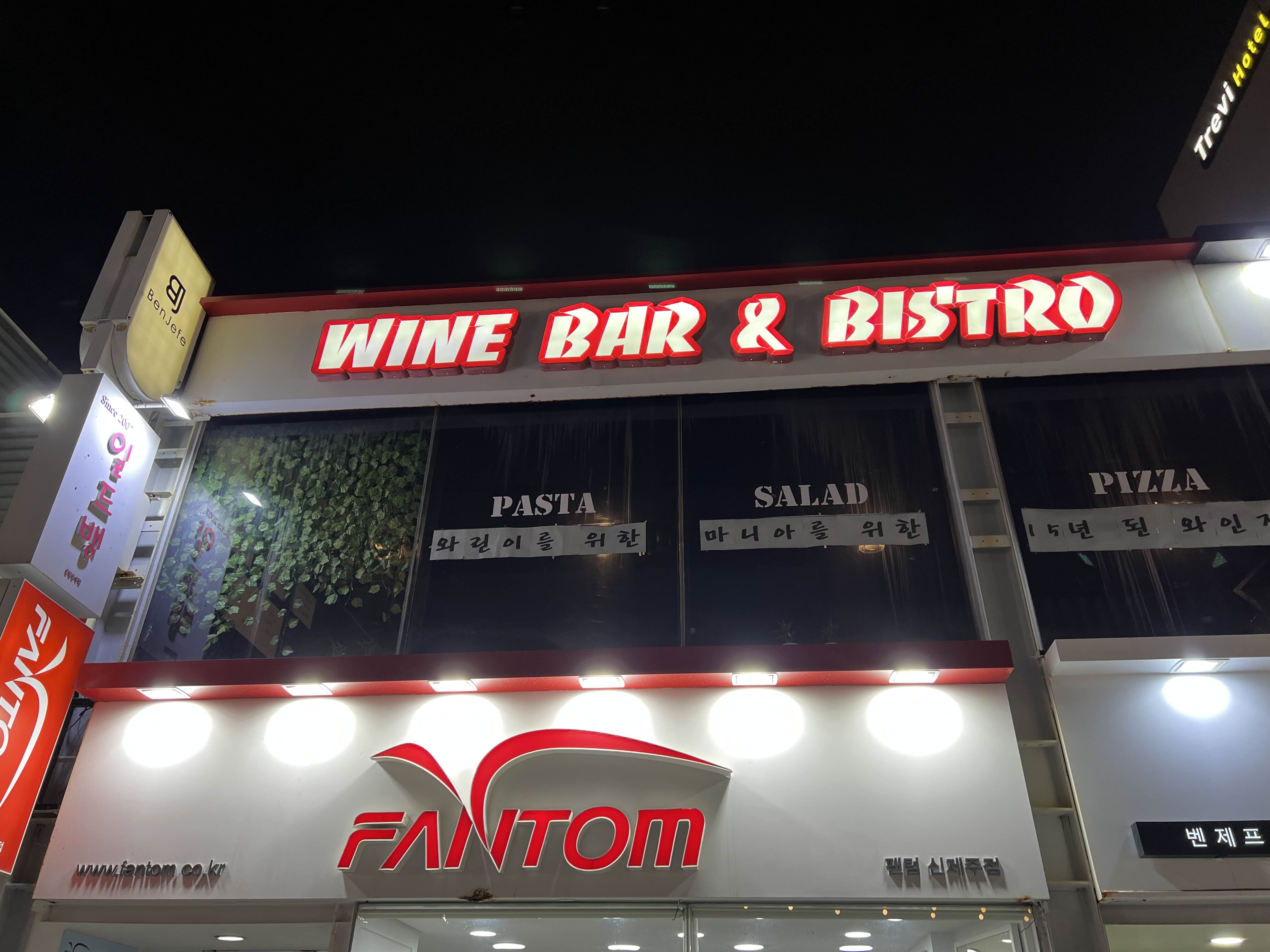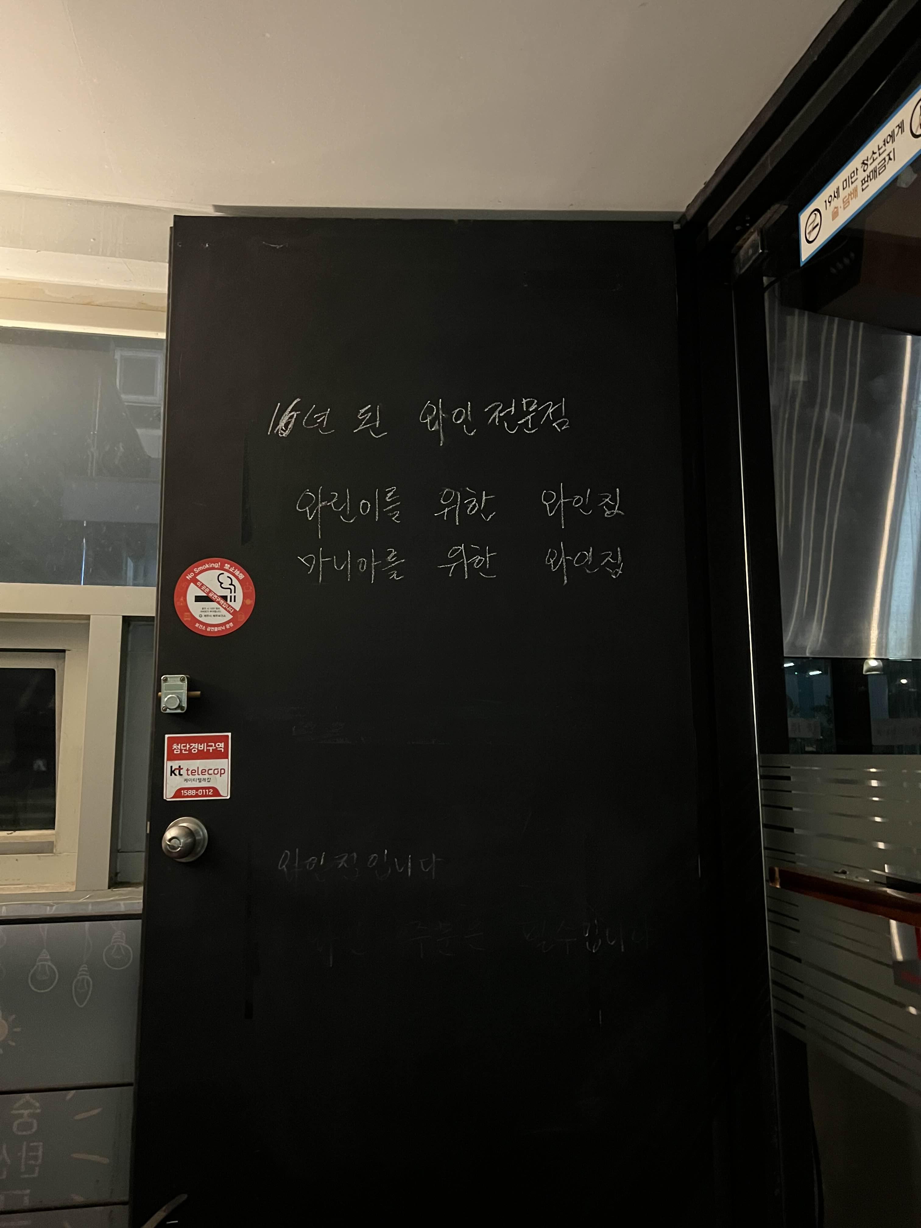강렬한 빨간색 간판과, 문 앞에 써 있는 16년된 와인 전문점에서