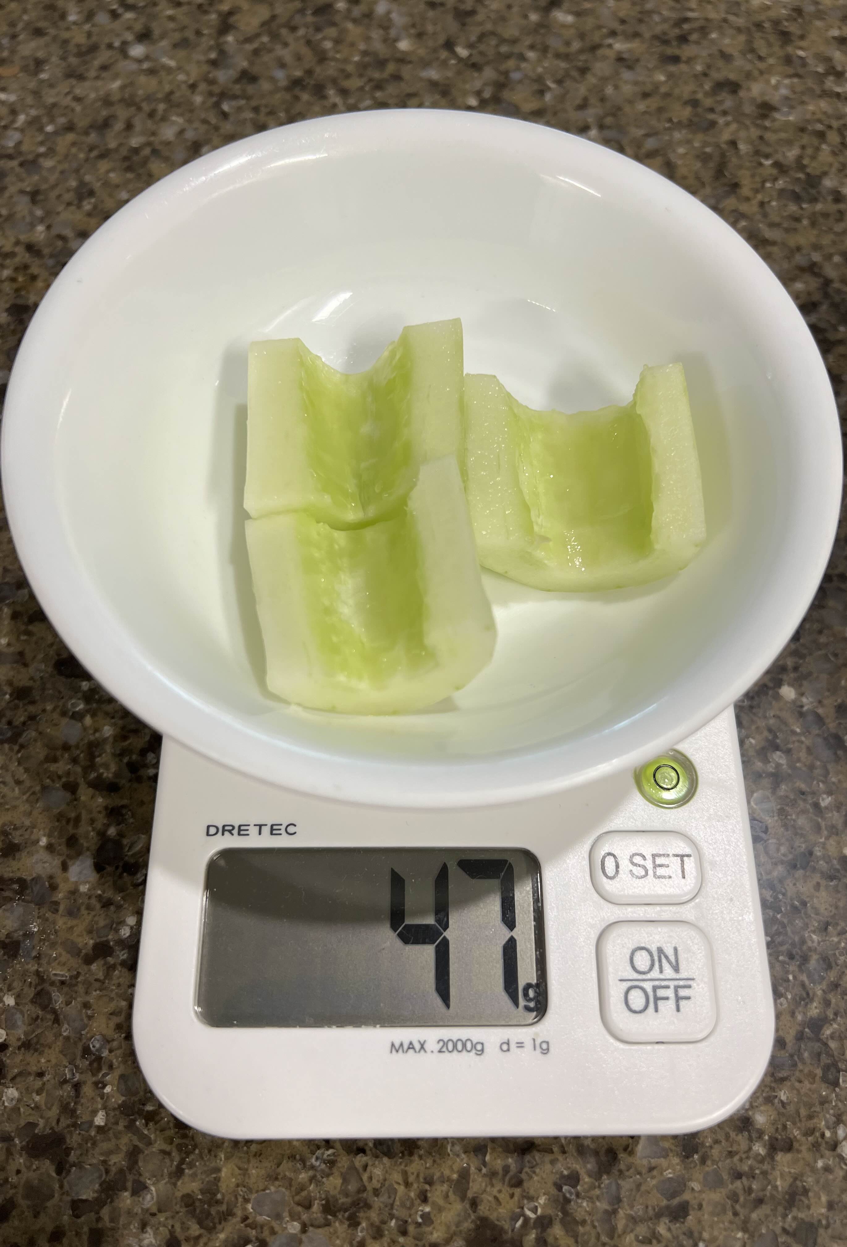 소고기 큐브 (10g) 3개, 청경채 큐브 (10g) 3개, 오이 47g 계량
