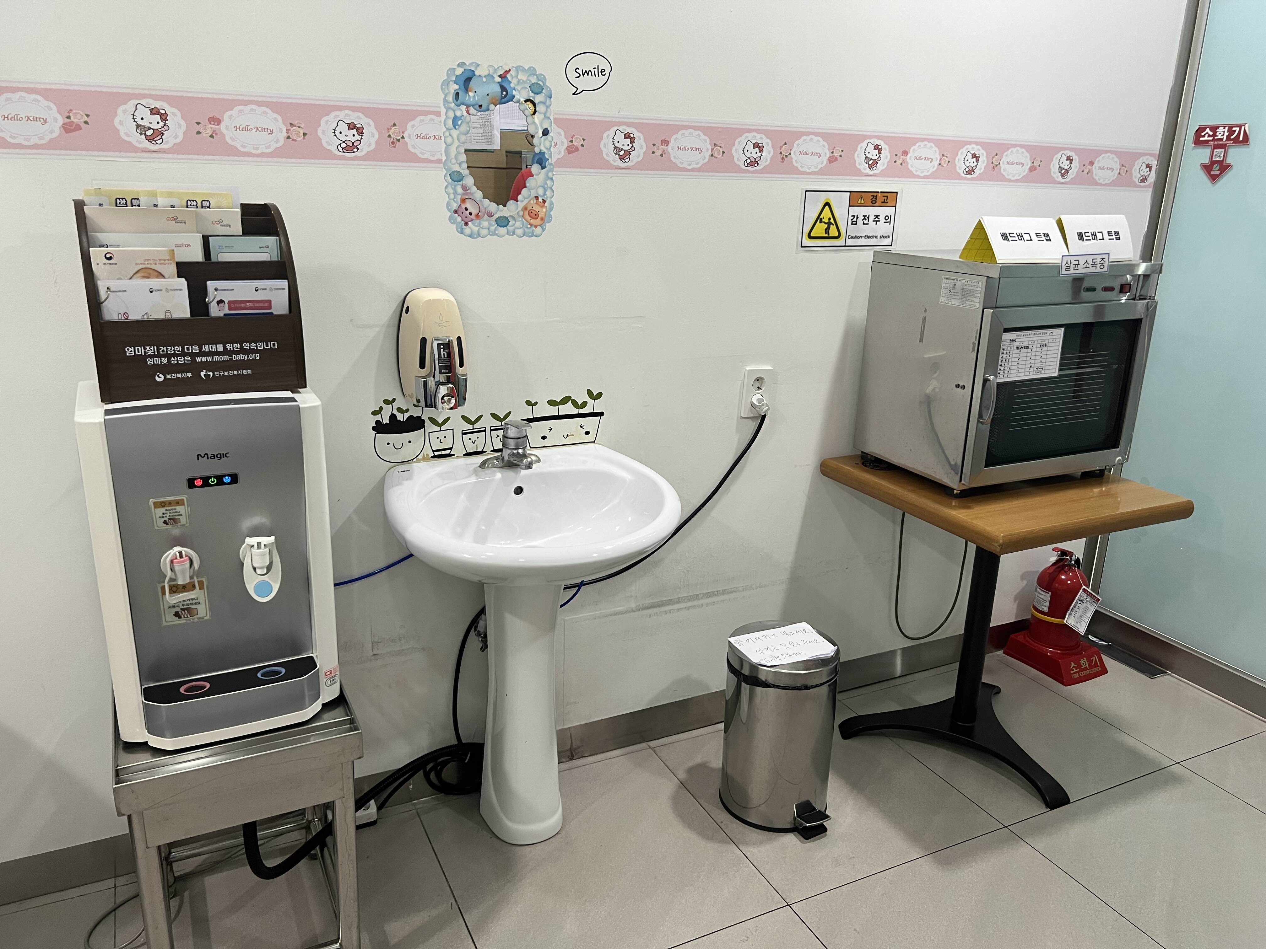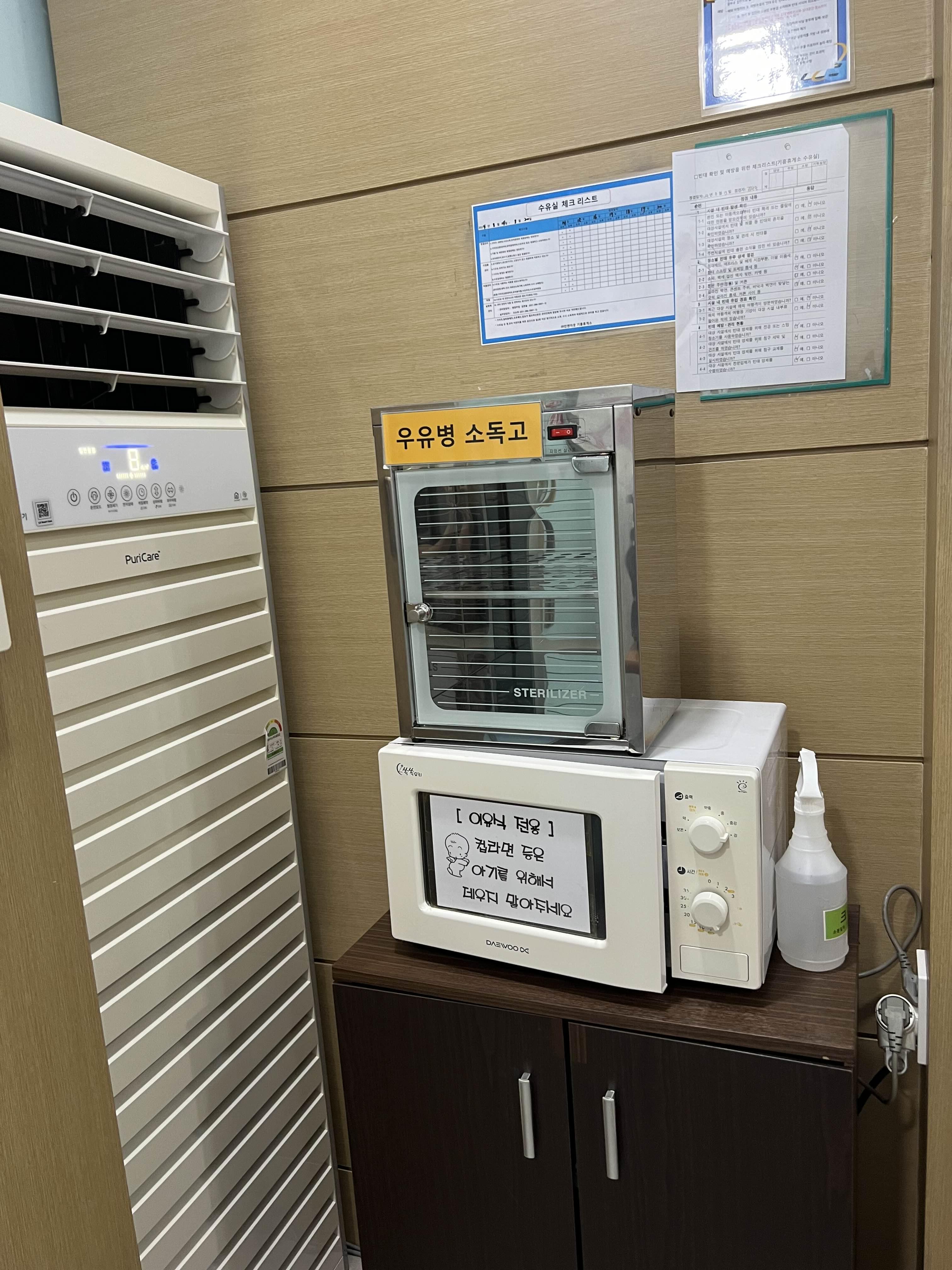 스탠딩 에어컨과 전자레인지, 젖병 소독기, 손소독제, 기저귀 일회용 교환패드까지 구비되어 있다.