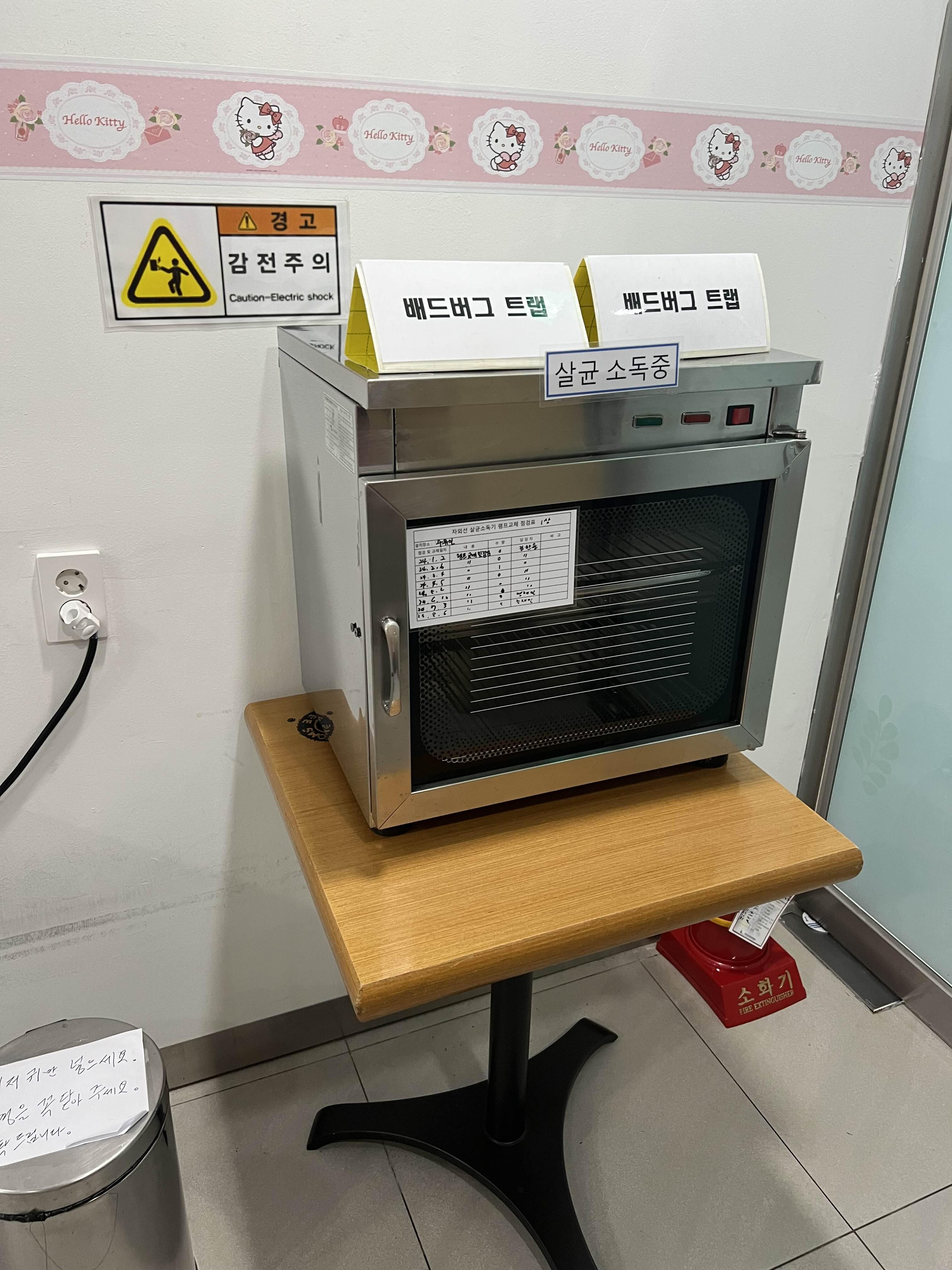 정수기와 세면대, 쓰레기통, 배드버그 트랩? 소독기