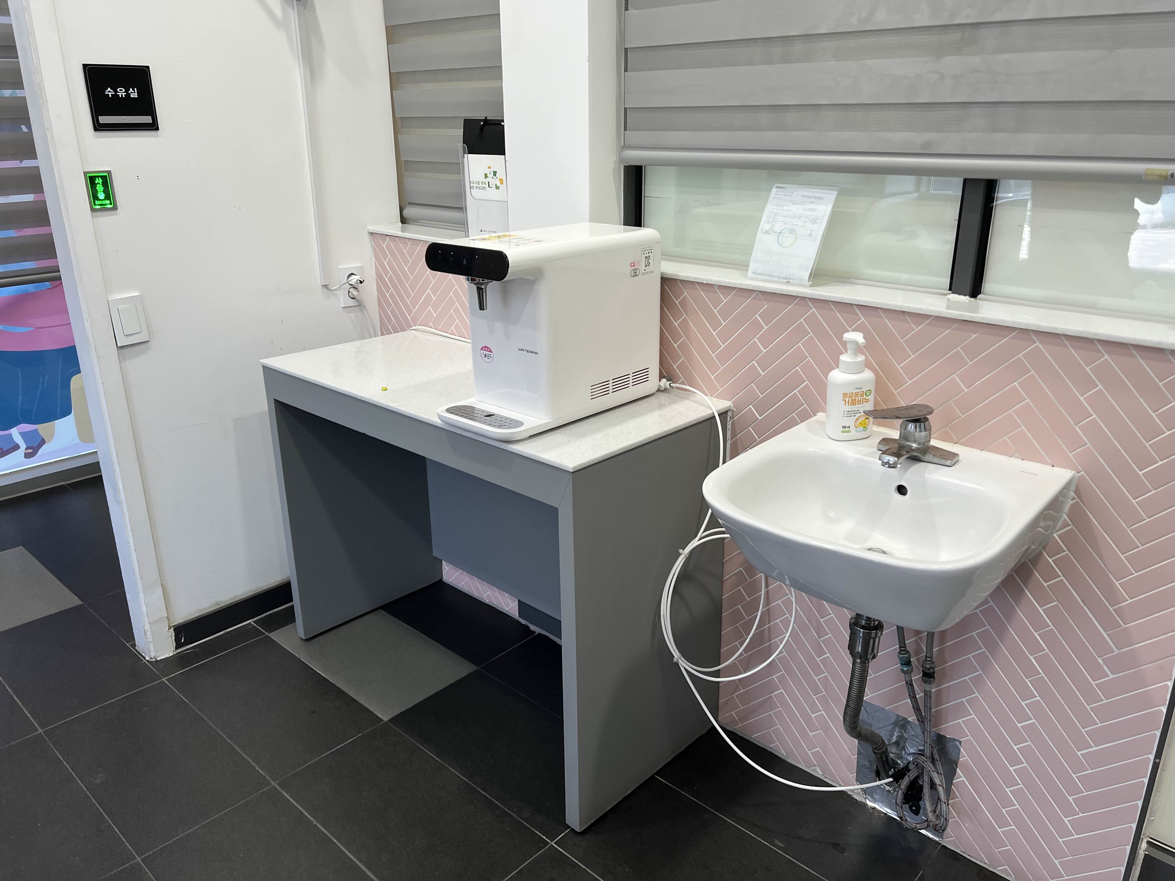 세면대, 거품비누, 정수기와 분유를 탈 수 있는 약간의 공간이 있다.