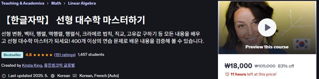 그러던 중 Udemy에서 괜찮은 선형대수 강의를 발견했는데,