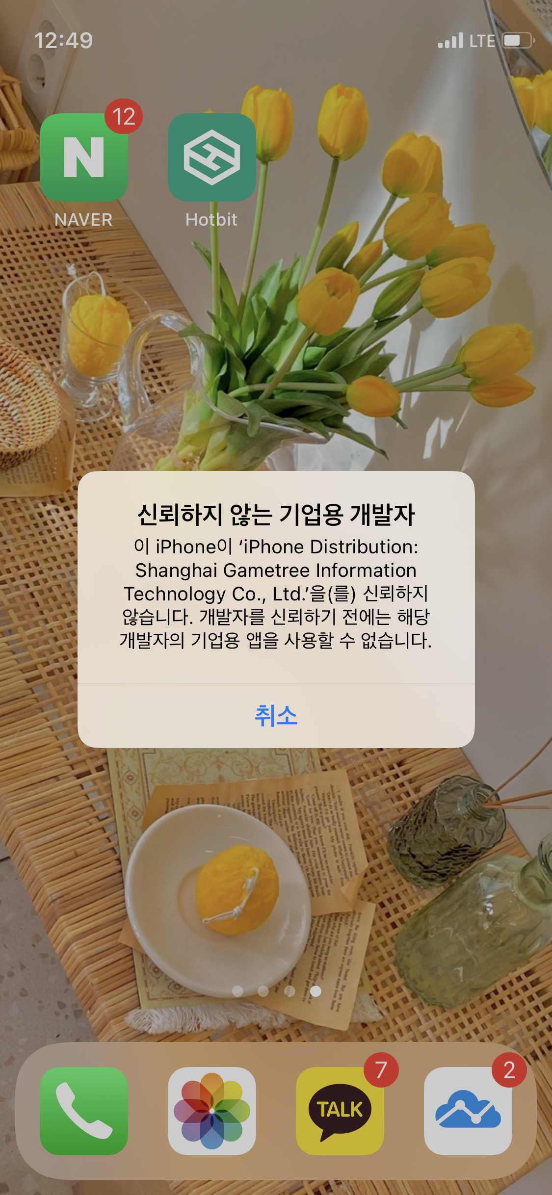 이렇게 신뢰하지 않는 기업용 개발자라는 창이 뜬다.
